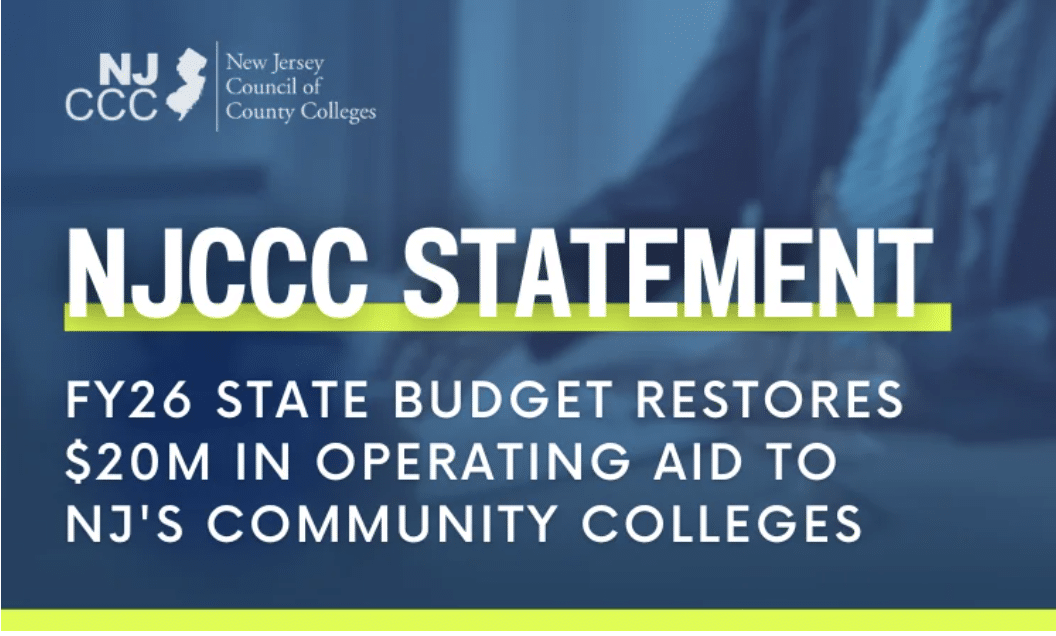 The New Jersey Council of County Colleges (NJCCC) on Tuesday issued the following statement on the signing of the $58.8 billion state budget for the 2026 fiscal year that began July 1. NJBIA successfully worked with NJCCC to secure the restoration of $20 million in state operating aid for community colleges that had been cut from the budget. “On June 30, the Legisla ...