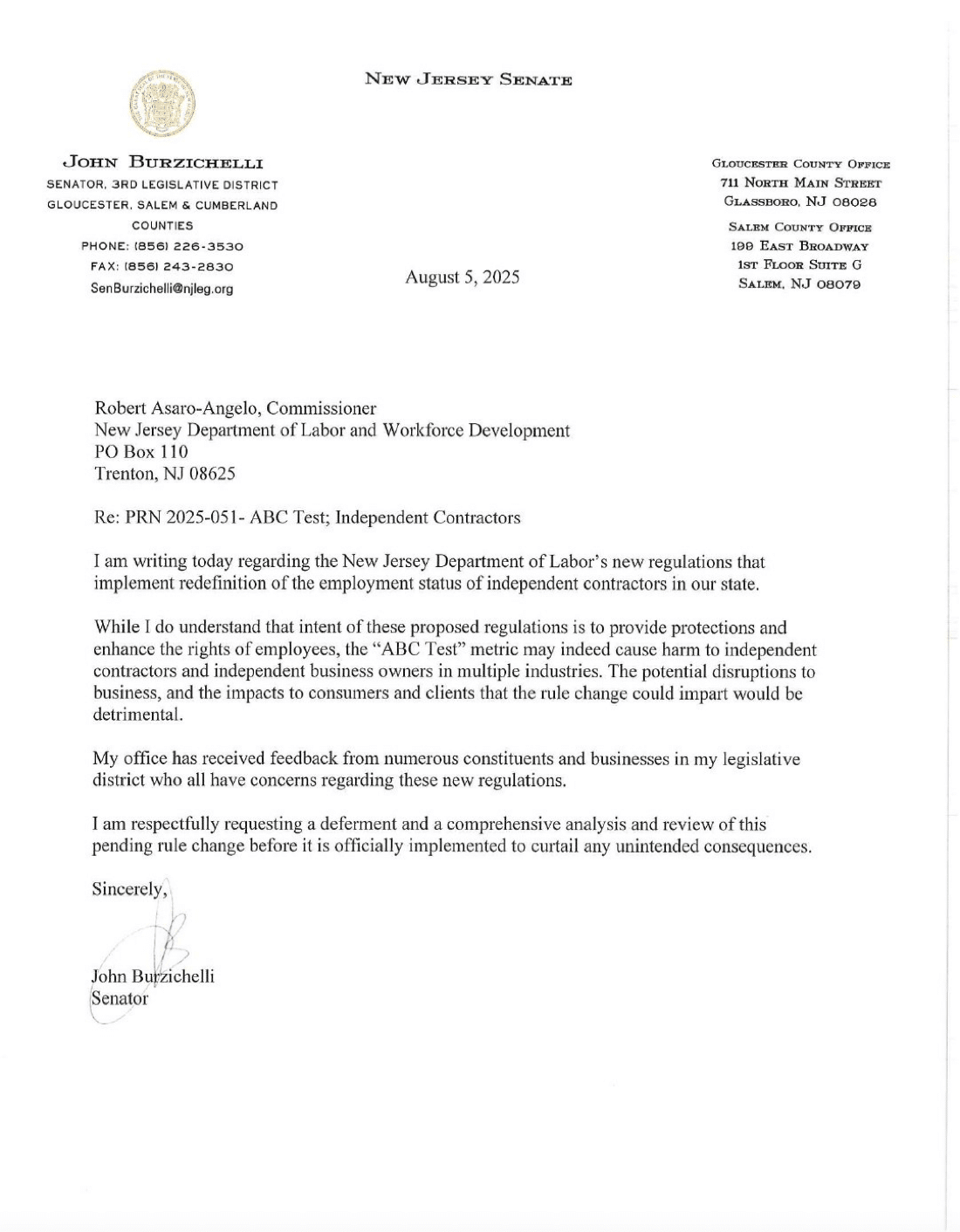Sen. John J. Burzichelli (D-3) is the latest lawmaker to join a growing number of legislators who have notified the Department of Labor and Workforce Development of their oppostion to its proposed rule that would classify more independent contractors as employees.